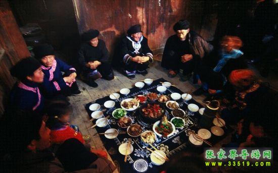 聚居于湘鄂川黔的土家族人過年,比其他民族要提前一二天。俗規(guī)農(nóng)歷臘月大,二十九過年,臘月小,則二十八過年,稱為過“趕年”。 土家族有著趕年的習(xí)俗,在農(nóng)歷臘月三十的早晨,土家族家家門口,都是紅燈高掛,鞭炮齊鳴。因?yàn)槟鞘峭良易迦碎_始趕年的時(shí)候,開始吃午餐的時(shí)候。 土家人趕年時(shí),先把菜全部上桌后,再盛一碗飯,加一些葷菜,飯碗上放一雙筷子,那時(shí)土家人先祭拜他們的祖先,然后家人上桌開始趕年。土家人年餐菜都必須是自家養(yǎng)的和自家產(chǎn)的,自家養(yǎng)的如豬、牛、羊、魚等,自家產(chǎn)的如紅薯粉、黃豆、青菜等等。 土家人的趕年餐每道菜都有它的含義。 土家三樣(血豆腐、臘豬干、臘香腸):當(dāng)土家兒女在桌上看到這三道菜時(shí)就會(huì)體會(huì)到父母一年來的辛勞。 土家紅曲魚:這意味著年年有余。 大塊豬頭肉:豬頭肉在沒有切碎之前,先祭拜自家的祖先,然后切好上桌,是土家人在桌上吃的第一道菜,所以也稱為土家第一肉。大塊臘肉在土家族是流行 365 天,無論你走在土家族哪一個(gè)村寨,餐桌上都少不了一碗大塊臘肉,這表示著土家漢子能吃能做,也意味著土家人對(duì)貴客的熱情招待。 香菇燉雞:一般在農(nóng)村土家父母平時(shí)總是舍不得宰殺自家的老母雞,因?yàn)檫@時(shí)候他們會(huì)想到身在他鄉(xiāng)的兒女們都在百忙的工作中,很少用高營養(yǎng)的東西補(bǔ)給自己的身體。所以只有等到農(nóng)歷臘月三十也就是土家族趕年時(shí),土家父母才能盼到兒女們的團(tuán)聚,這時(shí)候就會(huì)毫不猶豫的將老母雞燉給兒女們吃。 另外,土家人年餐桌上都會(huì)有青菜、豆腐,這是意味著土家父母叫兒女們?cè)谕饷孀鍪缕狡桨舶病⑶迩灏装住?/p> 土家趕年餐全席食譜 第一道:土家臘豬肝 (原料:自制臘豬肝,自制鹽菜) 第二道:土家血豆腐 (原料:自制豆腐,花椒,辣子,陳皮) 第三道:土家香腸 (原料:豬小腸,瘦肉,花椒,辣子,陳皮) 第四道:土家紅曲魚(火鍋)(原料: 7 斤以上的草魚,紅曲魚) 第五道:大塊豬頭肉 (原料:臘豬頭肉,干蔥頭) 第六道:大塊臘肉 (原料:自制臘肉,大蒜頭) 第七道:香菇燉雞 (原料:自產(chǎn)蘑菇,自養(yǎng)土雞) 第八道:雞湯紅薯粉 (原料:自制高湯,正宗紅薯粉絲) 第九道:米湯青菜 (原料:青排菜,米湯) 第十道:煎大塊豆腐 (原料:自制豆腐) 第十一道:土家美點(diǎn) (原料:粘米粉,糯米粉,黃豆粉,紅糖) 第十二道:農(nóng)家水果拼盤 (原料:各種水果)