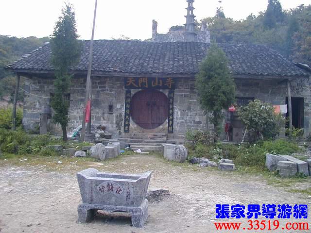 (天門山寺)天門山寺最早建于唐代,古稱云缽庵、靈泉院、嵩梁堂,明代時,因擇址不當(dāng)而屢遭風(fēng)摧又常遭水荒,才將天門山寺從東部山頂遷移至此。以前這里古木參天,濃蔭蔽日。古寺門楣上刻有“天門仙山”四字,大門兩邊的對聯(lián)是:“天外有天天不夜,山上無山山獨尊”,傳為李自成部將野拂撰書。進(jìn)門為大佛殿后面有觀音堂,兩邊六間平房,最后一棟是祖師殿,規(guī)模宏大。民間概括為“三進(jìn)堂、六耳房,磚墻鐵瓦鍋如壙”。山寺原建筑十分講究,飛檐翹角,雕龍畫鳳,并塑有佛道神像菩薩等。還有大鼓一面,千斤大鐘一口,一座七級石塔和一個大化錢爐。據(jù)碑刻記載,自清乾隆至民國五年的163年間,天門山寺共修葺過七次,香火曾盛極一時,湘鄂川黔邊境十多個縣的信徒絡(luò)繹不絕,都來這里進(jìn)香拜佛?,F(xiàn)天門山旅游股份有限公司正在大規(guī)模地修復(fù)天門山寺,昔日的繁華又將重現(xiàn)。