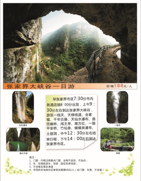 早張家界市區(qū)7:30分市內(nèi)各酒店接(武陵源08:20分出發(fā))