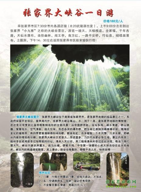 上午9:30分左右到達(dá)張家界大峽谷,游覽一線天,天梯棧道,全家福,千年古藤,天仙水瀑布,曲徑幽林,闖王亭,南方紅,一路平安橋,竹仙泉,蝴蝶泉瀑布,土匪洞