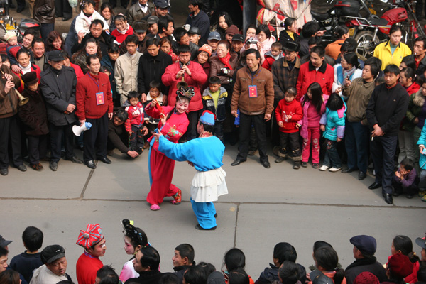 蚌殼用蔑扎骨架,蒙布或紙,外繪蚌紋,以紅綠綢鑲邊,內貼水銀碎鏡片。由一旦一丑表演。旦扮蚌殼精,身背蚌殼,表演“扯四角”、“開蚌”、“戲水”、“整容”、“照鏡”、“戲翁”等動作,含蓄逗趣,活潑可愛。丑扮魚翁,手持撒網,表演“踩水”、“窺蚌”、“戲蚌”等動作,詼諧風趣。常令人捧腹。伴奏以弦樂為主,伴以竹笛,幽雅悅耳。