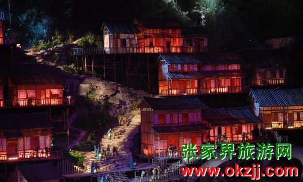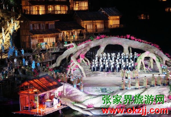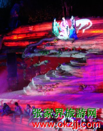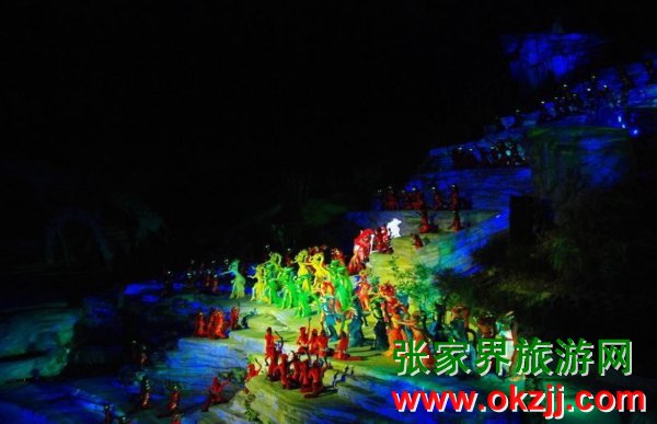 是目前世界第一臺有完整故事情節(jié)的山水實(shí)景音樂歌舞劇。舞臺選址在天門山風(fēng)景區(qū)山門口內(nèi)至天門山頂?shù)恼麠l峽谷,總投資達(dá)到1.2億元,演員隊伍達(dá)530多人。主舞臺以10000平米的玻璃鋼打造,是目前世界最大的全景玻璃鋼舞臺。