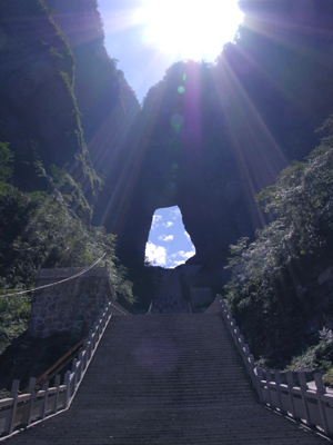 天門翻水在海拔 1500 米 的天門左側(cè)絕壁,大旱季節(jié)卻出現(xiàn)洪水怒瀉的奇觀,隨后就是中國社會變革,人類浩劫,自然災(zāi)害的突發(fā).這,真的是天機預(yù)警嗎? 翻水紀(jì)年表: 1949 , 1965 , 1976 , 1989 , 1998 天門,這一大自然的造物杰作,嵌于千米絕壁之上,如明鏡高懸,似天門獨啟,一年四季吐納云霧雷電,充滿著天宮帝閣的神秘感,其真正的形成原因至今還沒有令人信服的科學(xué)解釋.