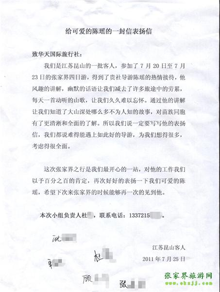 - 游客夏先生為表?yè)P(yáng)導(dǎo)游李姣姣寫來表?yè)P(yáng)信致我張家界... [14811]